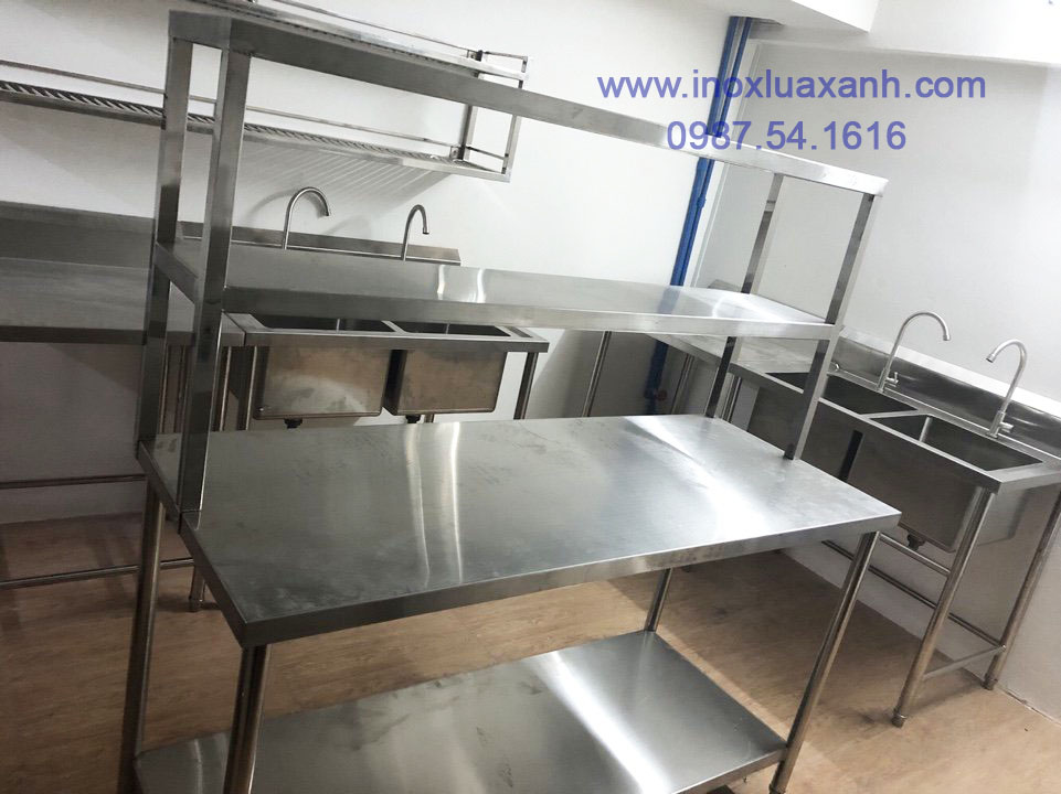 Bàn inox 2 tầng có kệ trên, chậu rửa công nghiệp, kệ treo tường...